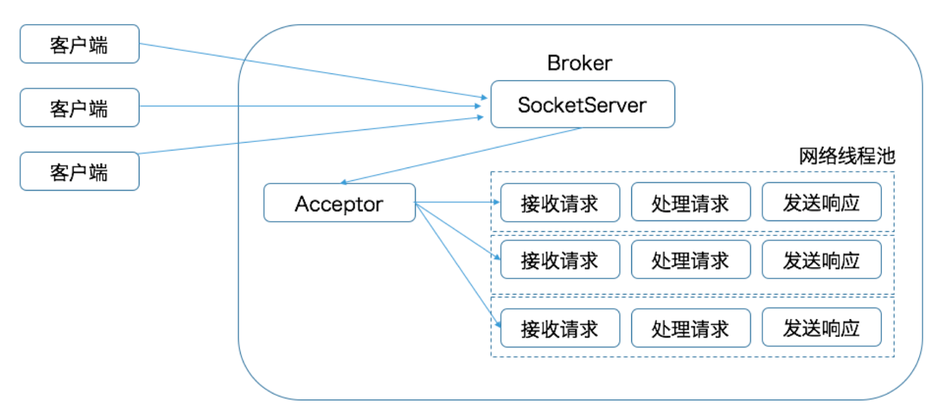 Kafka 的 Broker 端有个 SocketServer 组件,类似于 Reactor 模式中的 Dispatcher,它也有对应的 Acceptor 线程和一个工作线程池,在 Kafka 中,这个工作线程池有个专属的名字,叫网络线程池。Kafka 提供了 Broker 端参数 num.network.threads,用于调整该网络线程池的线程数。其默认值是 3,表示每台Broker 启动时会创建 3 个网络线程,专门处理客户端发送的请求。
