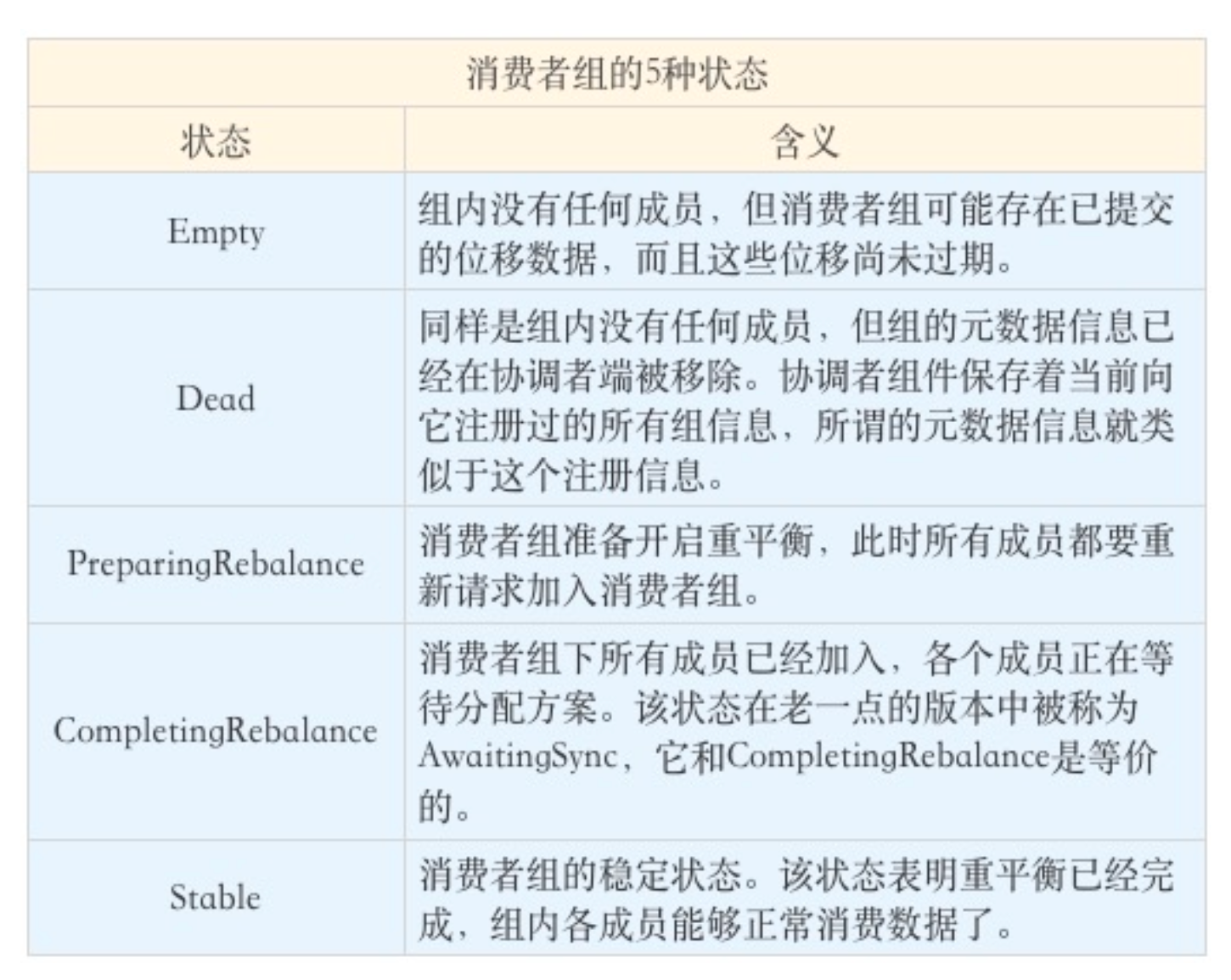 Kafka 为消费者组定义了 5 种状态,它们分别是:Empty、Dead、PreparingRebalance、CompletingRebalance 和 Stable。