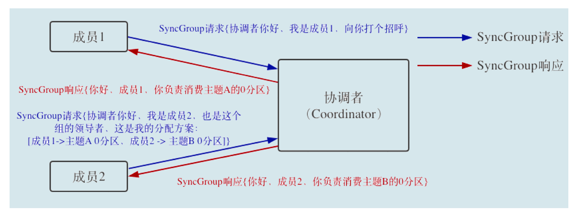 在这一步中,领导者向协调者发送 SyncGroup 请求,将刚刚做出的分配方案发给协调者。其他成员也会向协调者发送 SyncGroup 请求,只不过请求体中并没有实际的内容。这一步的主要目的是让协调者接收分配方案,然后统一以 SyncGroup 响应的方式分发给所有成员,这样组内所有成员就都知道自己该消费哪些分区了。